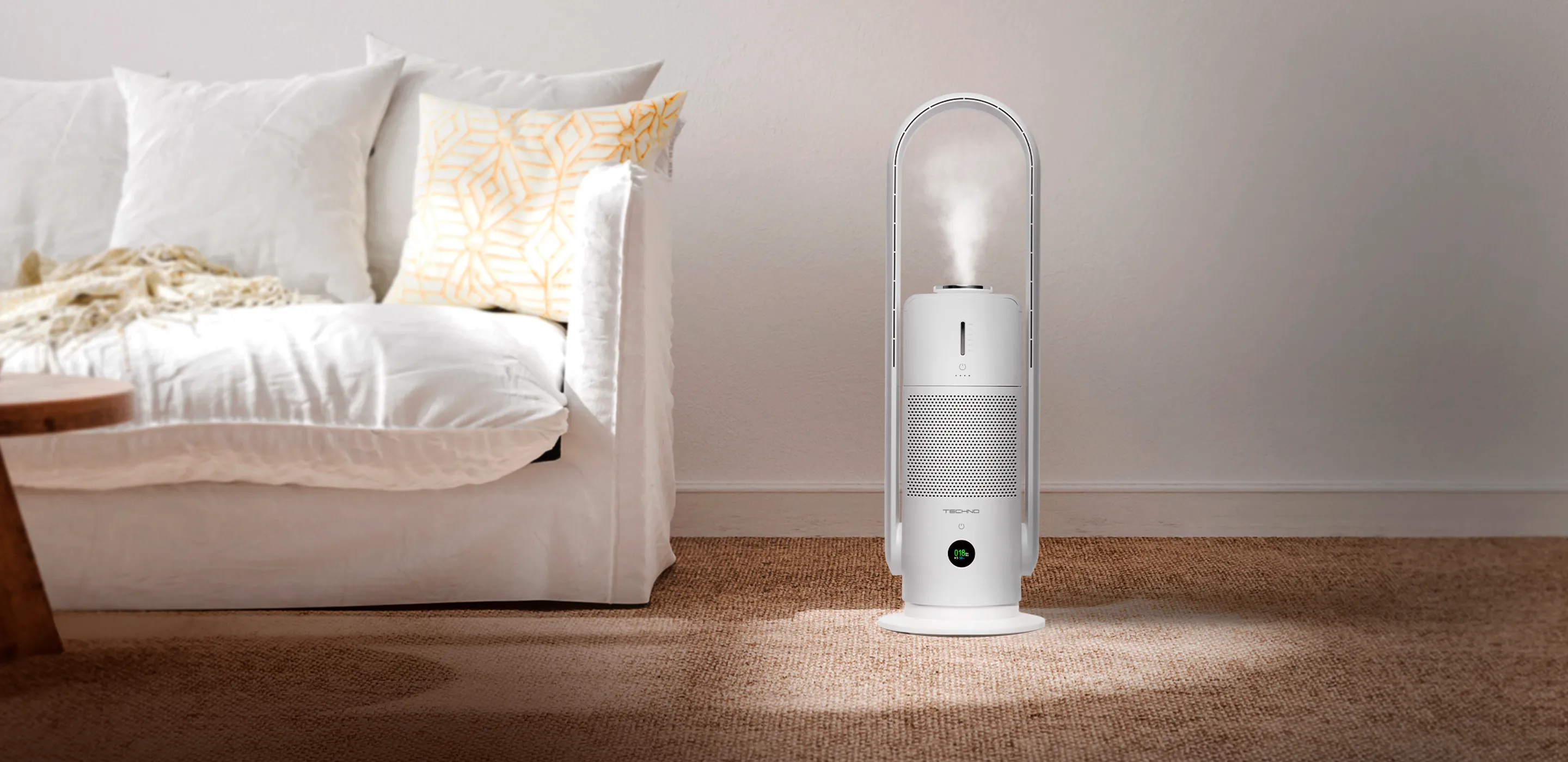 Функция увлажнения включается автоматически при низкой влажности. Это защищает кожу и дыхательные пути от сухости, сохраняя здоровый микроклимат дома.